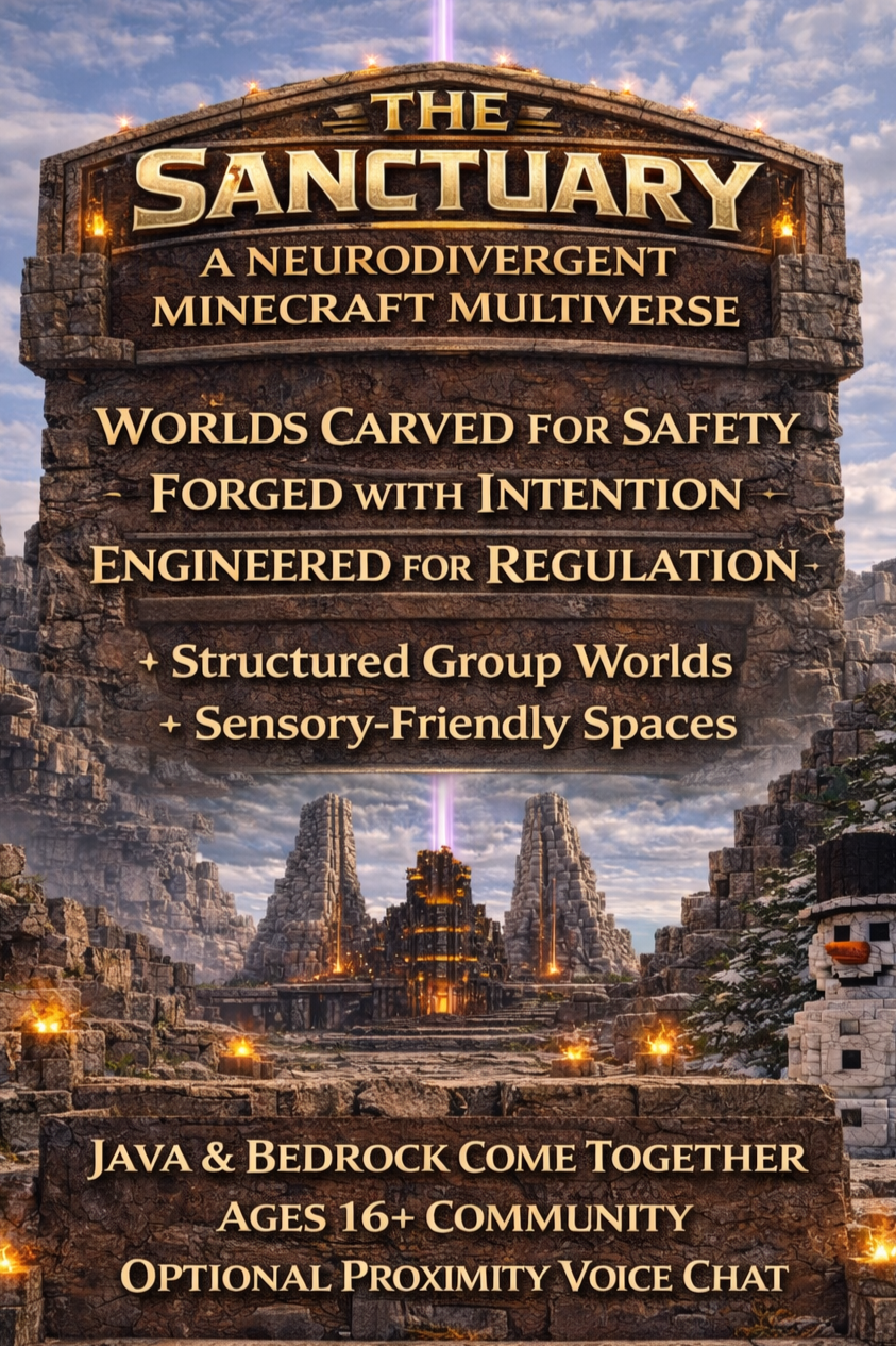 The SanctuaryNeurodivergent Minecraft multiverse A project of Neurodiverse Inclusive Solutions This server is designed to be low pressure, predictable, and respectful of different energy levels. You can play solo or with others. Social interaction is optional. Clear rules and moderation help keep the space steady and safe. First Name Last Name Email Address Click here to join Name and Email required for a more predictable environment Server Log-inBedrockIP: 69.41.177.223Port: 25630JavaIP: 69.41.177.223:25630The foundation is being laid. Be respectful and build something that lasts.Join the Discord World guides, rules, and community chat for each worldJoin Discord